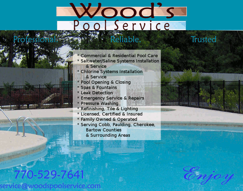 Wood's Pool Service Commercial & Residential Pool Care Saltwater/Saline Systems Installation and Service Pool Opening and Closing Spas Fountains Leak Detection Emergency Service and Repairs Pressure Washing Refinishing, Tile & Lighting Licensed, Certified, Insured Family Owned and Operated Cobb, Paulding, Cherokee, Bartow pool, service, chlorine, saltwater, saline, repair, maintenance, cleaning, commercial, residential, HOA, Acworth, Marietta, Kennesaw, Powder Springs, Dallas, Bentwater, Brookstone, Lost Mountain, Cobb, Paulding, Bartow, Atlanta